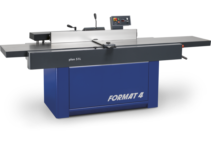 La dégauchisseuse massive plan 51L de la marque haut de gamme FORMAT4 se démarque par son nouveau design et surtout par les trois mètres de longueur de la table de dégauchissage. La table de dégauchissage avec une longueur de 1650 mm qui assure l’alimentation offre à elle seule suffisamment de surface de contact pour des pièces de grandes dimensions. La dégauchisseuse FORMAT4 plan 51L est la première dégauchisseuse qui dispose d’une table de dégauchissage rabattable pour l’usinage de joints creux et pointus. Grâce à la construction compacte du guide, la dégauchisseuse peut être installée directement contre le mur de l’atelier. Le pont protecteur de dégauchissage intégré au bâti de la machine est rabattable et le front de la machine assure une liberté de mouvement maximale lors de travaux de dégauchissage. Le réglage de la hauteur électrique Power Drive avec pupitre de commande ergonomique à la hauteur des yeux offre un confort d’utilisation maximal même en version standard.